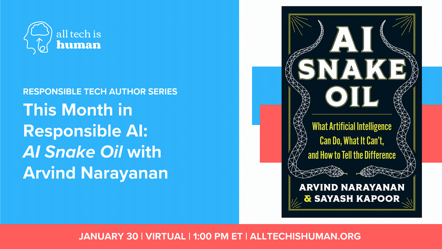 👋We hope you can join our livestream next Thursday with Arvind Narayanan, author of AI Snake Oil. And for those of you focused on online safety, we will be having a curated gathering for 50 people in Manhattan on Feb 11th to celebrate Safer Internet Day and hear from speakers including Tracy Chou and Alexios Mantzarlis.