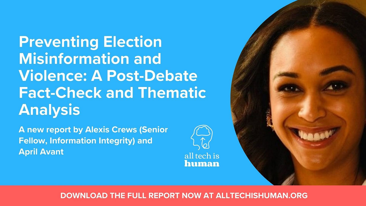 Alexis Crews (Senior Fellow for Information Integrity) shares her latest report, Debunking the Divide: A Post-Debate Analysis on Misinformation, Fear, and Election Integrity. It takes a deep dive into key claims from the 2024 presidential debate, exposing how misinformation and fear-based rhetoric are shaping public discourse. This report is an essential resource for anyone working to uphold election integrity, with fact-checking and detailed analysis designed to cut through the noise. You can read the full blog post and access the report here. ICYMI, Alexis hosted two fireside chats on September 12th with political experts focused on Demystifying the Conversation on Technology and Elections