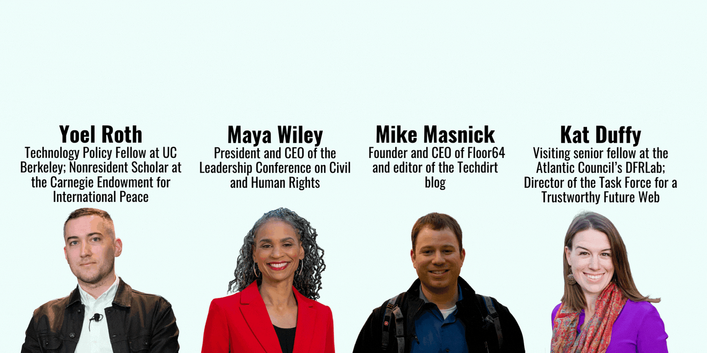 đJoin us on Monday, June 26th in NYC as we welcome Yoel Roth (Tech Policy Fellow at UC Berkeley, former Head of Trust & Safety at Twitter), Maya Wiley (President and CEO of the Leadership Conference on Civil and Human Rights, renowned civil rights attorney and activist), Mike Masnick (Â Founder and CEO of Floor64 and editor of the Techdirt blog), and moderator Kat Duffy (Visiting senior fellow at the Atlantic Councilâs DFRLab; Director of the Task Force for a Trustworthy Future Web) for our panel. There will also be a mixer with food, drink, and ample time to share resources and learn from others that are deeply committed to co-creating a better tech future.