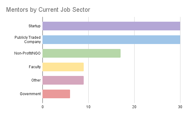 We have mentors from over 18 time zones working in so many different areas of Responsible Tech. Ethical AI was the most popular interest area this year for both mentors and mentees, bumping down Trust & Safety from the top slot in previous cohorts. Youâll find some data visualizations from our (nearly complete) list of mentors below. Congrats to all of our new and returning mentors and THANK YOU for sharing your knowledge, network, and expertise to help lift up new voices in the Responsible Tech movement. As we mentioned in our last newsletter, we had 700 applications from 49 countries in just two weeks and are continuing to work on ways to expand our mentorship program!