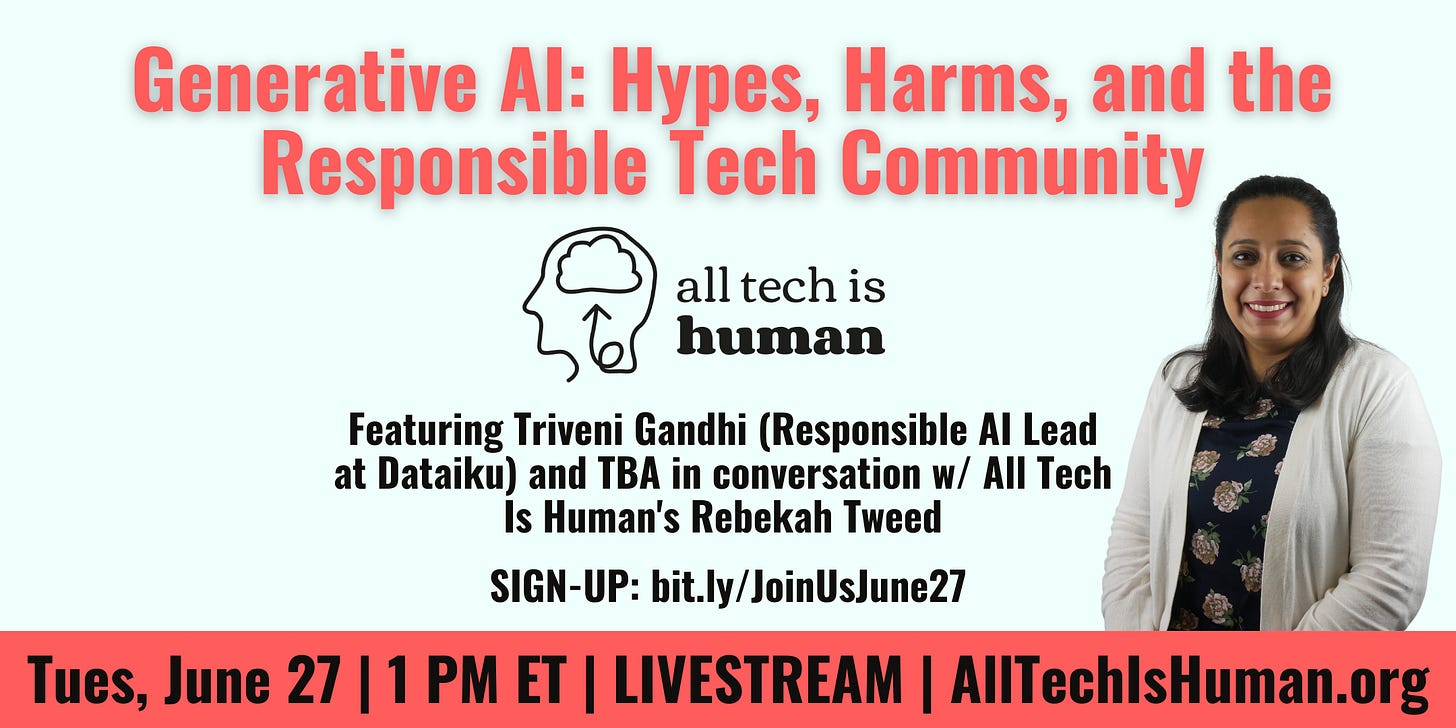 On Tues, June 27th we will welcome Triveni Gandhi (Responsible AI Lead at Dataiku) and another special guest to be announced shortly. Read Triveniâs full bio at our event page and join us online for this important conversation!
