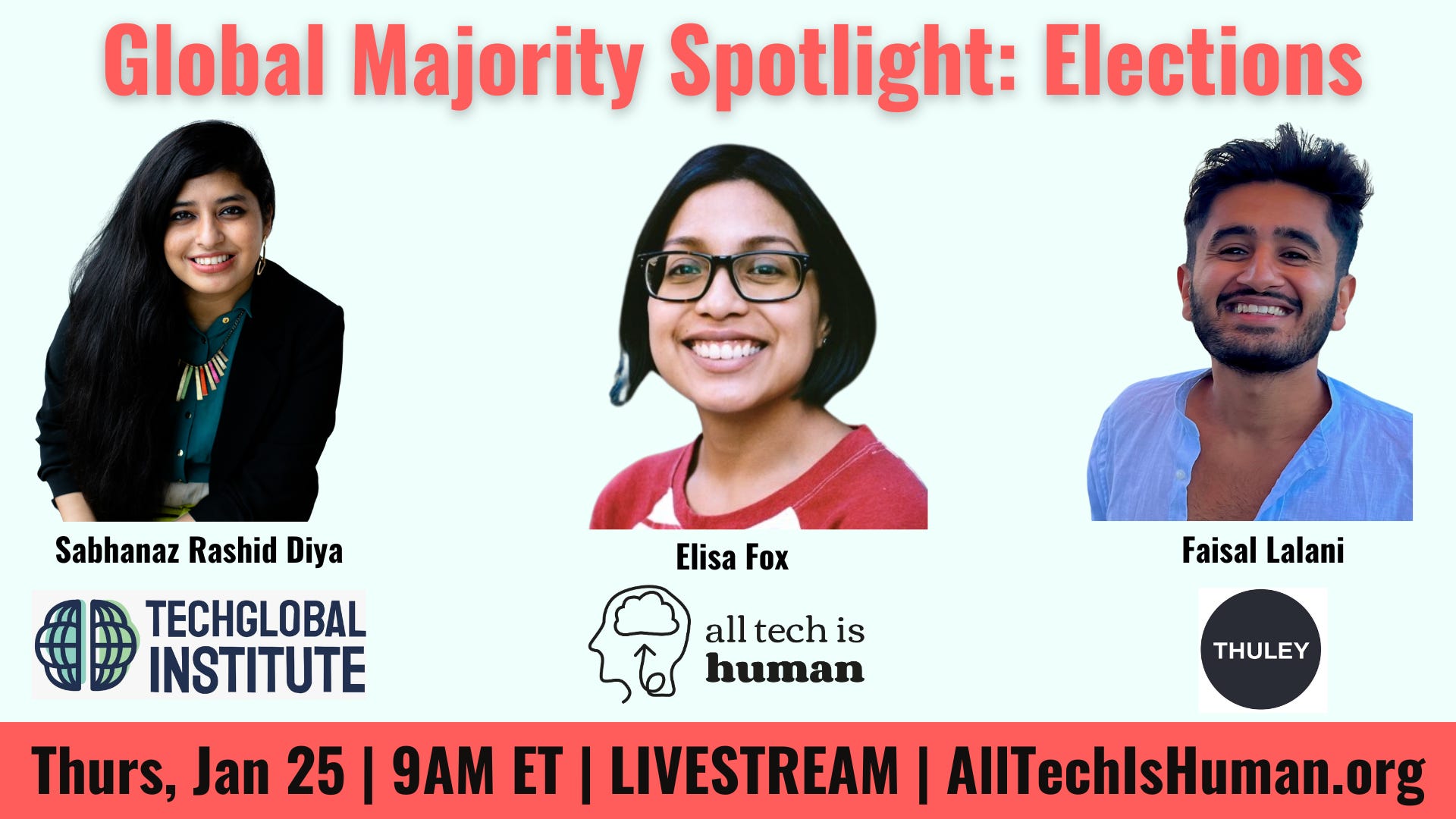 The livestream will feature Sabhanaz Rashid Diya (Tech Global Institute), Faisal Lalani (Thuley), and All Tech Is Human’s Elisa Fox.
