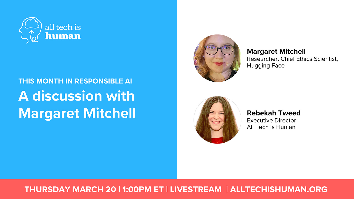 Join us this Thursday, March 20th at 1pm ET for a conversation between Rebekah Tweed and special guest Margaret Mitchell (Researcher and Chief Ethics Scientist at Hugging Face) on the risks of fully autonomous agents. Your questions will be incorporated into the conversation.