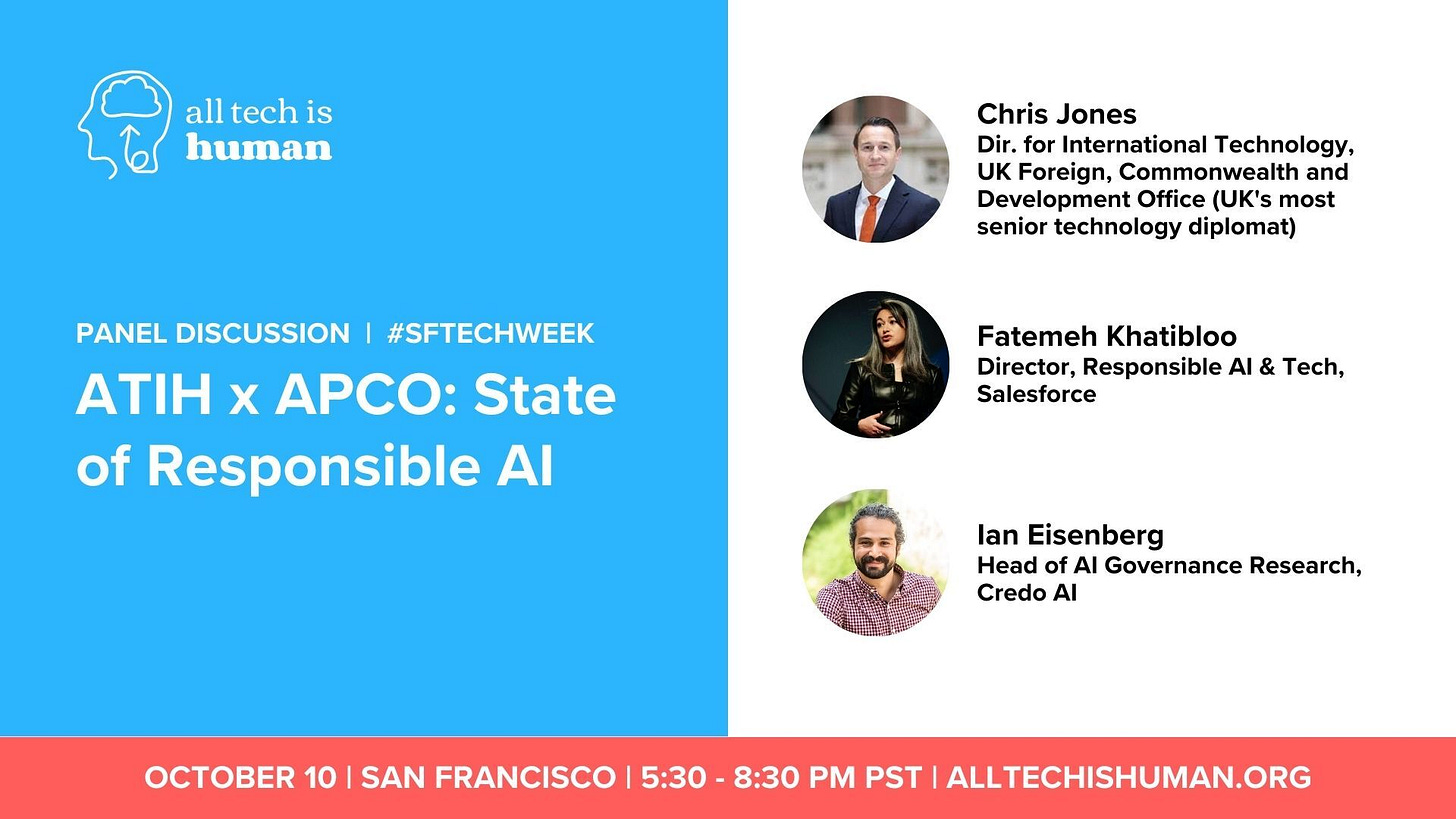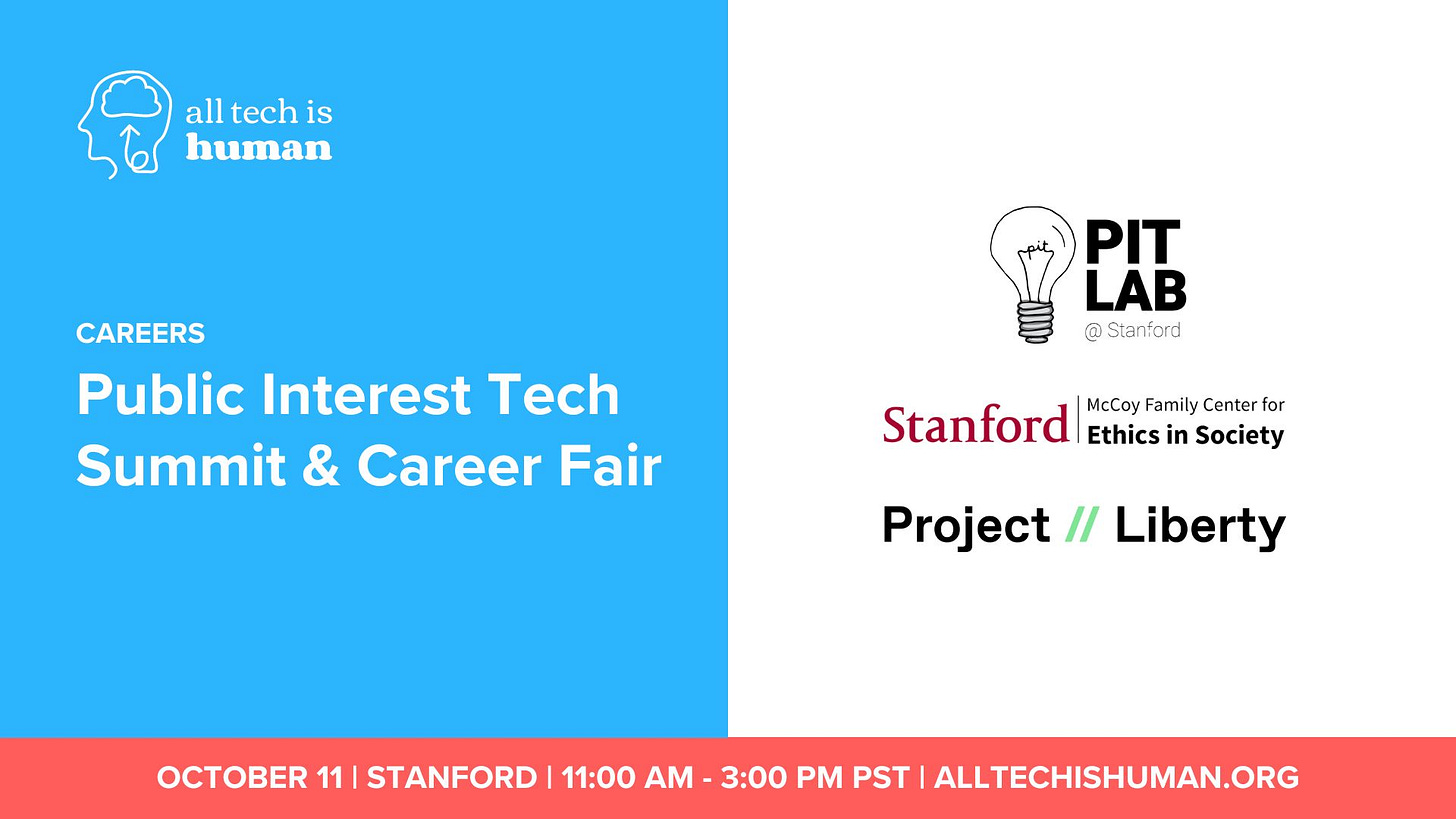 📅And then after attending a bunch of UNGA-related gatherings in NYC at the end of the month, we are off to San Francisco where we’ll have a Responsible Tech Mixer on October 9, a gathering on the state of Responsible AI on October 10, and then on October 11 we’re a partner for a Public Interest Technology Career Fair at Stanford.