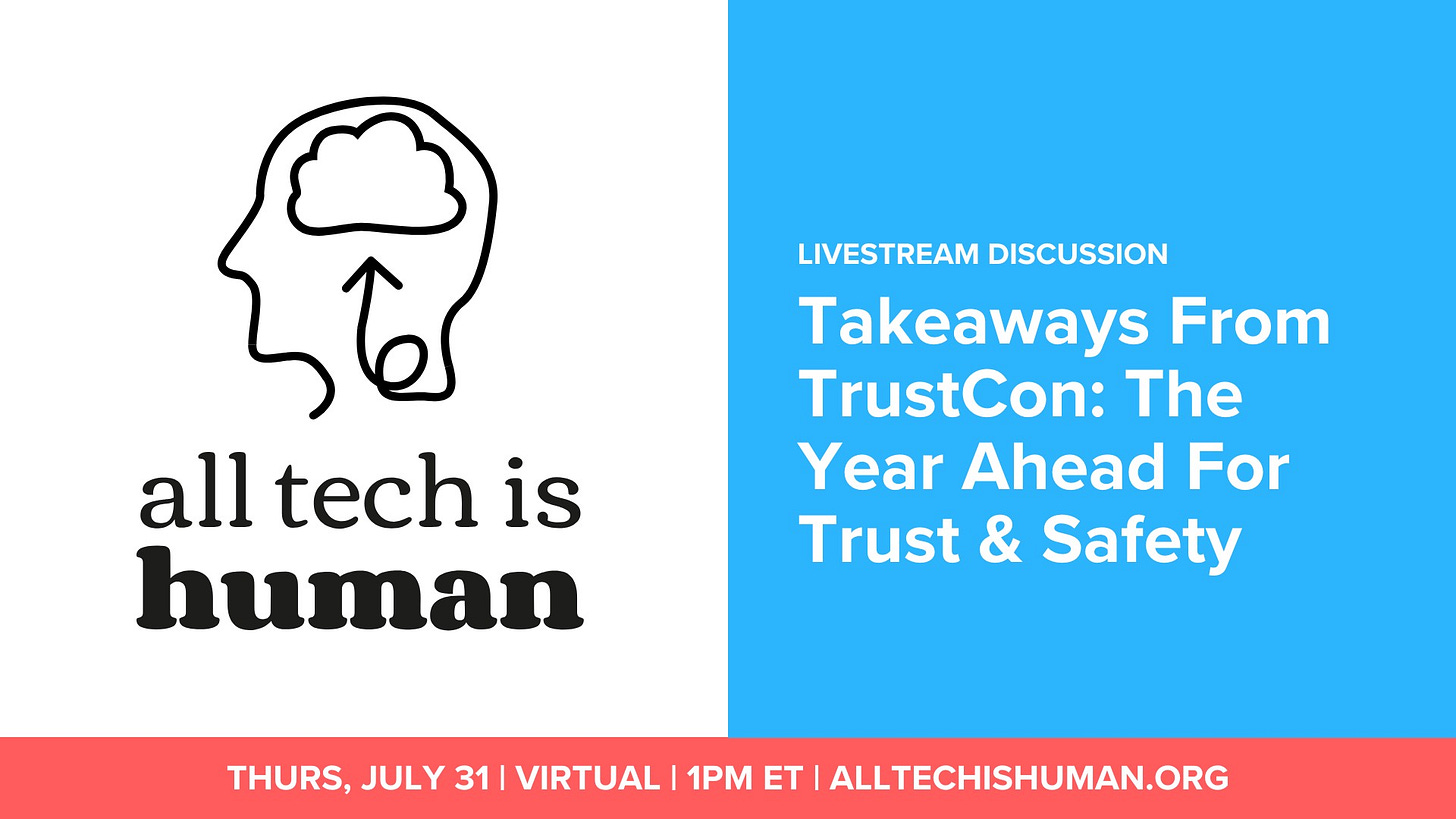 This week, many of those in Trust & Safety (such as Sandra Khalil from our team) are in SF at TrustCon. Next week, we hope you can join our livestream on July 31st to discuss takeaways from TrustCon + the future of Trust & Safety.